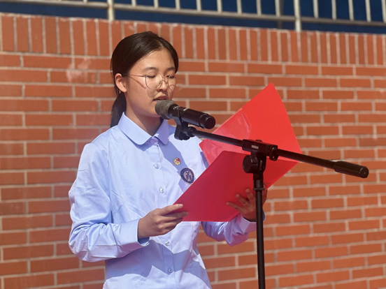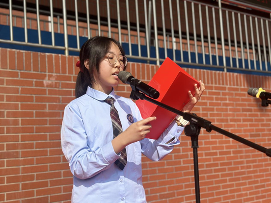 2025级4班学生代表王晓悦发言。回望来路,从嘉兴南湖的小小红船到领航中国的巍巍巨轮,我们的祖国走过了一条波澜壮阔的复兴之路;如今,行走在祖国的大地上,我们能看到繁华都市里高楼林立、车水马龙,科技创新的浪潮奔涌向前。而祖国的繁荣昌盛,从来不是从天而降的奇迹,而是一代代中国人用汗水、智慧甚至生命换来的成果。作为新时代的至善学子,我们肩负着传承先辈精神、续写祖国辉煌的重任,要将个人的成长与国家的命运紧密相连,以达济之志为动力,努力学习科学文化知识,提升自身素养,为祖国的繁荣富强贡献自己的一份力量,让青春在为祖国、为人民的奉献中焕发出绚丽光彩。