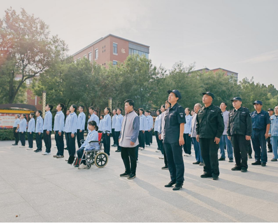 当雄壮的《义勇军进行曲》奏响,鲜艳的五星红旗迎着秋风冉冉升起,全场人员肃立行注目礼,目光追随着国旗攀升的轨迹。嘹亮的歌声回荡在校园上空,每一个音符都承载着对祖国的赤诚与热爱,每一次抬头都饱含着对国家繁荣昌盛的祝福。晨光中,国旗的红与天空的蓝交相辉映,成为校园里最动人的风景,也将爱国的种子深深播撒在每一位参与者的心中。