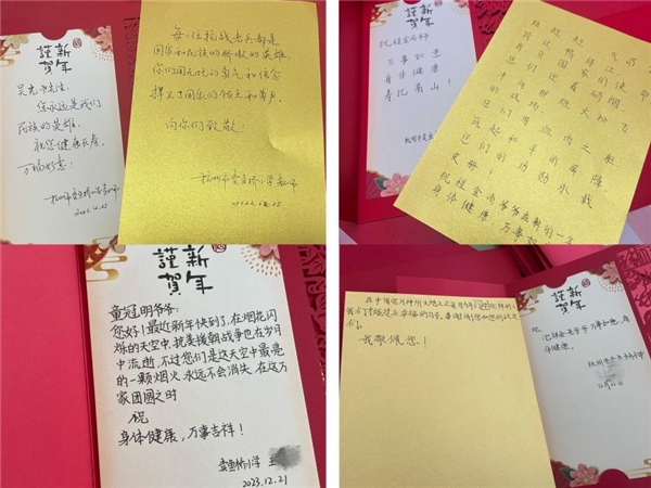 “今天一早就收到了浙江工业大学生物工程学院生物技术本科生党支部的大学生党员和杭州市卖鱼桥小学五6中队的少先队员及老师亲手写的新年祝福贺卡。有些意外,但非常感动!”杭州市富阳区正步公益服务中心的志愿者说,“我们的老兵收到后一定会很高兴的!”