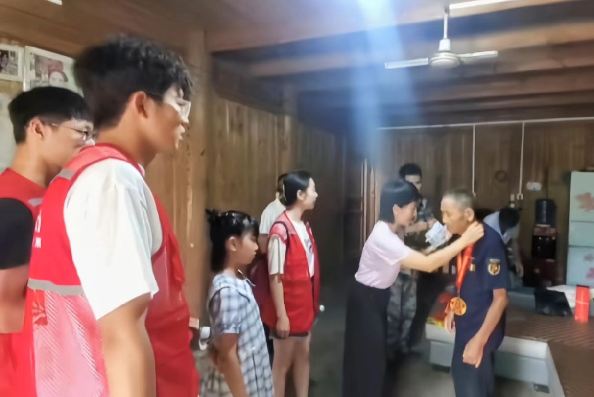 潘学珍老人老当益壮、精神矍铄,交流之间尽显老兵的英勇风姿。当志愿者问起为什么要参军时,他声音洪亮地回答:“宁愿热血疆场尽,不让神州列强凌!”回忆起当年参军打仗的日子,潘学珍的目光意味深长,像是被拉回了七十年前的战场,“手上成茧了,才不起泡”“一打瞌睡就嚼一颗辣椒”“有国才有家”,潘爷爷用朴实无华却饱含深情的语言,讲述着自己亲历的一个又一个战争故事……“脱不掉的是军魂,变不了的是忠诚,这份赤诚感动了我,让我久久不能平静。老人向我们讲述的战火硝烟与现在一派青山绿水,不正是红色精神的价值与体现所在吗……”带队教师魏代君和同学们说道。“抗美援朝,保家卫国。”在千千万万个如潘爷爷般的英雄心中,永远将中国共产党放在第一位,以党的指引为前进的方向,这是我们追寻的英雄事迹、革命故事,也正是中国共产党的故事!