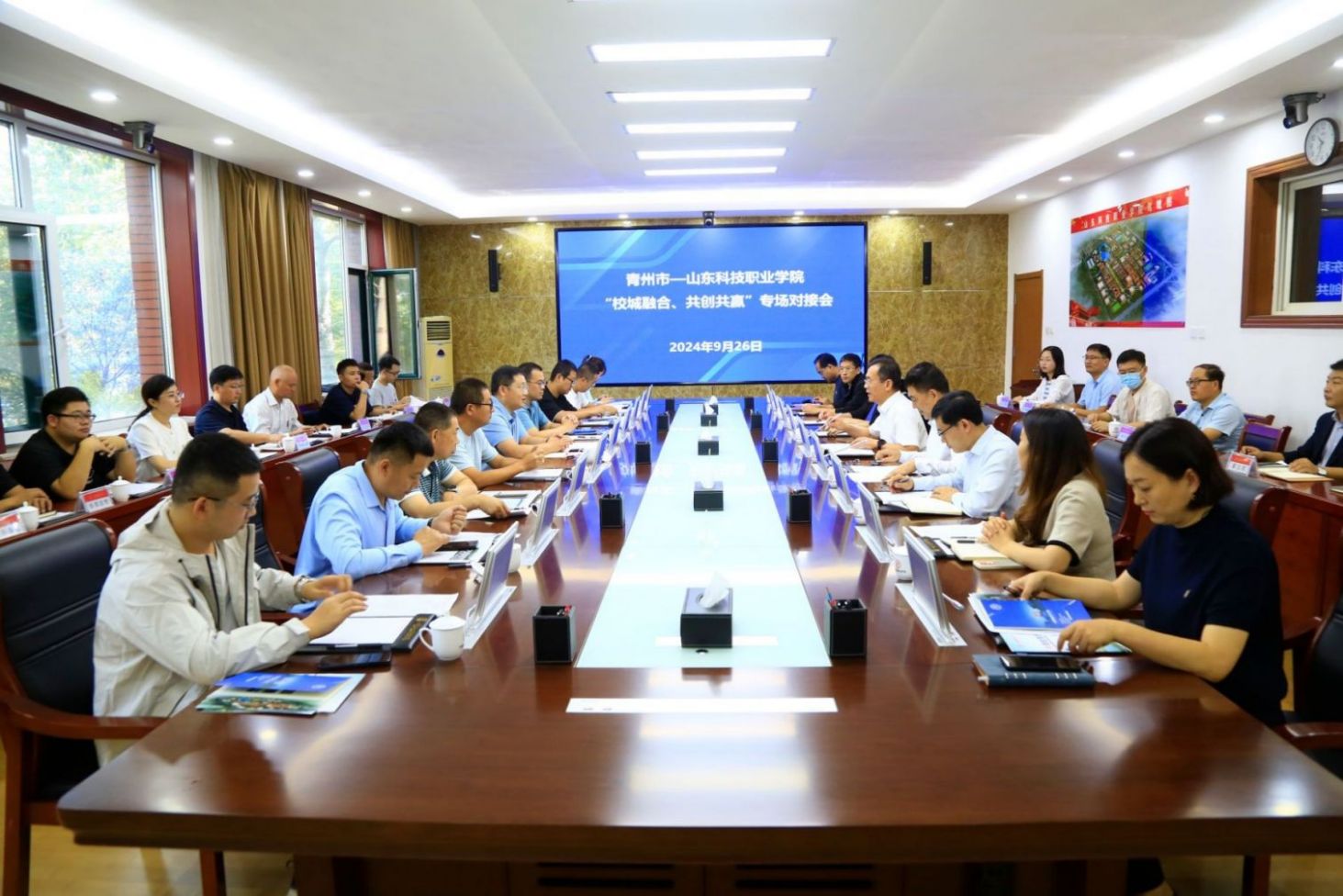 9月26日,由青州市科学技术局与山东科技职业学院共同举办的“校城融合、共创共赢”专场对接会在学校召开。青州市科学技术局党组书记段忠勇,学校党委副书记、校长刘福玉,党委委员、副校长董传民出席会议,青州市15家重点企业技术负责人及学校相关部门负责人、博士等高层次人才共计70余人参加会议。