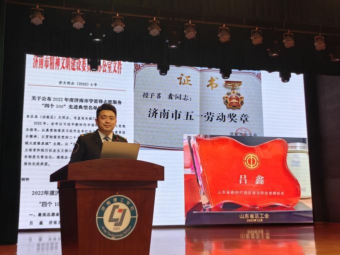 宣讲环节中,“全国十大见义勇为好司机”刘欣、“全国优秀共青团员”文采、“济南市五一劳动奖章”吕鑫依次上台,用心、用情地分享了自己的工作心得和成长历程。他们用自己的亲身经历,诠释了什么是劳模精神,什么是职业担当,如何用技能铸就辉煌。他们接地气的宣讲赢得了在座师生的阵阵掌声。