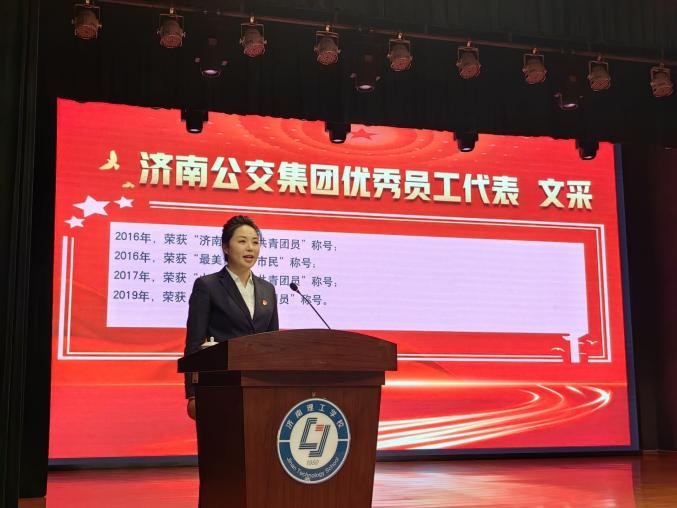 近日,济南理工学校与济南公交集团携手举办了“劳模精神进校园 点燃技能强国梦”优秀员工事迹分享会。此次活动不仅加强了校企合作,更为培养高素质技能人才、推动技能强国建设注入新的活力。济南公交集团职工培训中心主任田思民、培训部副主任傅娜、南部分公司七队书记刘欣、干线分公司六队服管员文采、西部分公司四队驾驶员吕鑫、济南理工学校党总支书记乌娟、党总支副书记 校长鹿学俊、副校长孙全、孟怀谷、王婷以及相关科室负责人、电子信息系、汽车商贸系部分师生代表300余人参加了活动。活动由王婷主持。