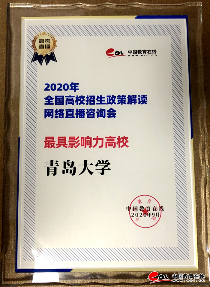 在评选中,青岛大学凭借出色的传播效果,在近500所高校中脱颖而出,获得“最具影响力高校”殊荣。这一奖项以院校直播间获得的播放量、观众数与互动总量,以及院校参与的直播场次为依据进行综合考量而得出,青岛大学在这些维度的综合考量中获得领先优势,是考生和家长心目中的“网红高校”。