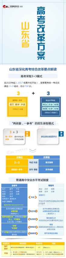 2018年3月,山东省印发《山东省深化高等学校考试招生综合改革试点方案》(以下称《试点方案》)。《试点方案》基本可以概括为四个重要变化:1.2020年夏季高考考试将不分文理科,统考只考语数外3科,外语听力可以考两次;2.高中学业水平考试增加了等级考试,考生根据报考专业要求,科目6选3参加等级考,成绩按等级转换规则转换后计入高校招生录取总成绩;3.建立并规范了高中阶段学生综合素质评价制度,评价结果作为招生录取的重要参考;4.夏季高考将按“专业(类)+学校”方式实行平行志愿投档,招生院校依据语数外3科统考成绩和选考的3科等级考成绩,参考学生综合素质评价择优录取。