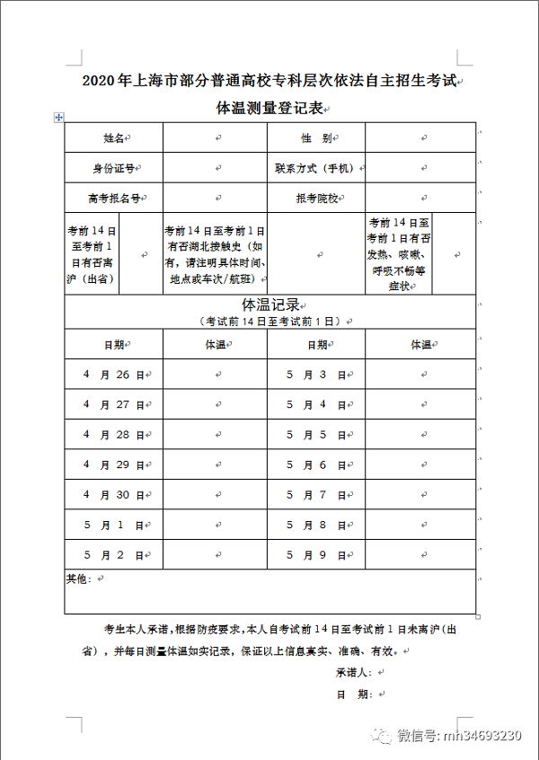 根据上海市教委的文件精神,各位考生必须从4月26日起到5月9日,每日认真测量体温并如实填入《2020年上海市部分普通高校专科层次依法自主招生考试体温测量登记表》(招生信息网“招生动态”附件中下载或点击下图保存图片下载均可)。并将表格各项内容填写完整签字后,于5月10日进入考场时交我校。信息不全或弄虚作假的考生,我校将按照相关防疫规定处理,如造成不良后果,考生须承担法律责任。