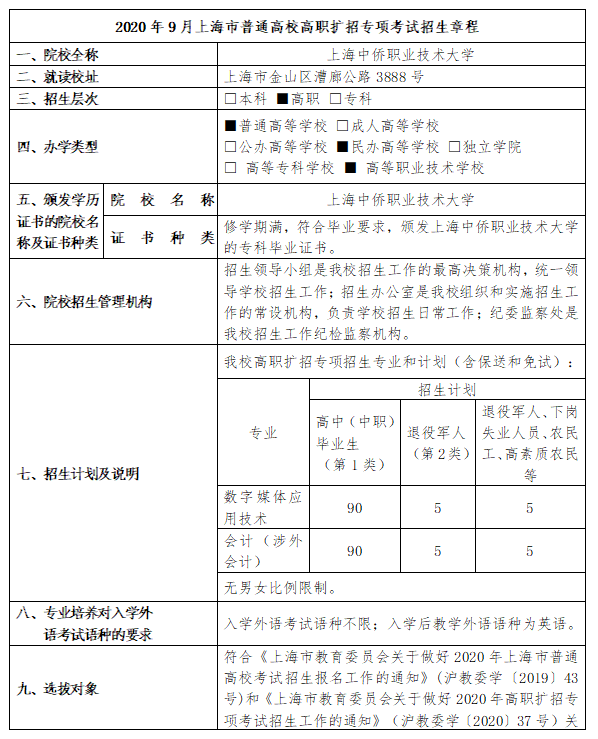 2020年上海中侨职业技术大学高职扩招招生章程