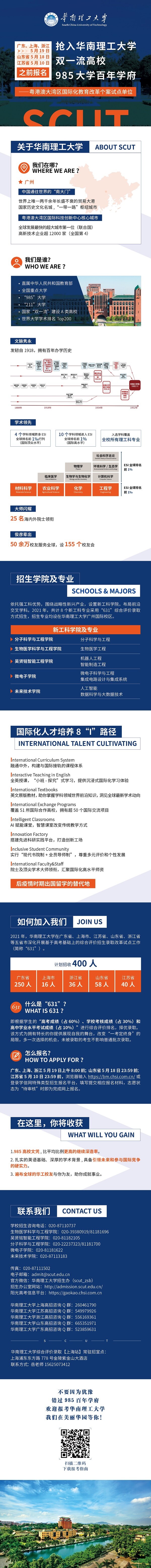 金宝搏188入口 讯招生专业均为热门的前沿交叉学科专业、采取注重学科特长的“631”综合评价招生录取方式、三倍招生人数、考生可以在上海面试、在国内坐享国际优质教育资源……粤港澳大湾区国际化教育改革唯一试点、“双一流”建设A类高校华南理工大学来沪宣讲招生。