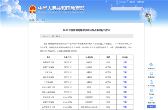 金宝搏188入口 讯8月9日,金博宝最新官方网站查询网址 官网发布《2021年度普通高等学校本科专业申报材料公示》。根据《金博宝最新官方网站查询网址 188金宝搏beat官网登录 司关于开展2021年度普通高等学校本科专业设置工作的通知》,本年度专业申报工作已经结束。各高校共申报国家控制布点专业306个、尚未列入本科专业目录的新专业139个。按照通知要求,现对相关材料予以公示,公示期为8月9日-9月9日。