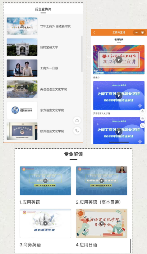 更为重要的是,招生小程序还包含了3个模块的视频栏目,分别是:【招生宣传片】、【专业解读】和【工商外直播】