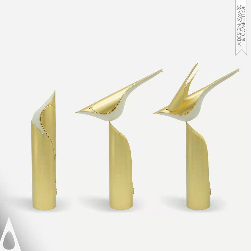 设计说明:“喜上眉梢”是一款以喜鹊为灵感,具有激励用户积极生活的现代式智能台灯。通过按压底部的圆形按钮,可以实现该灯的三种不同鸟形状态的自由切换。第一种形态是收拢状“喜鹊归巢”,这种形态下的光源较小且温和,不伤眼睛,也是最节省空间的形态,适合于卧室床头,可做小夜灯用;第二种形态是立式状“翺首驻足”,仿佛环视四周欲要起飞,可以照亮更大面积的空间,适合于办公场所;第三种形态是起飞状“展翅高飞”,昂扬向上充满活力,在灯光的衬托下,栩栩如生的喜鹊展翅高飞。喜鹊寓意美好幸福,“喜鹊到好事到”,既有向上的态度又有美好的祝愿。