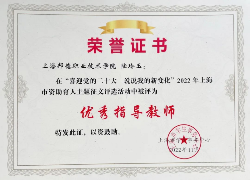 为全面展现党的十九大以来全市受到国家资助的学生在党和国家的关心关怀下奋发向上、励志成长的青春风采,以实际行动庆祝党的二十大胜利召开,市学生事务中心在全市高中教育及以上学校范围内开展了“喜迎党的二十大说说我的新变化” 资助育人主题征文活动,经各单位推荐申报、市学生事务中心组织省级学生资助管理中心主任等专家集中评审,现将评选结果予以公布。上海邦德职业技术学院获奖名单如下:资助育人主题征文优秀组织奖