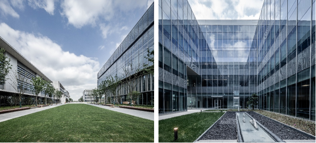 二期校园由国际知名的帕金斯威尔(Perkins&Will)建筑设计事务所设计,吸收美式校园与中式校园的建筑之长,融入杜克大学和武汉大学的元素,以及中式传统江南水乡风格,体现中西方文化的交融之美。校园的入口轴线与南面的大渔湾景观对应,让湖面成为校园的重要对景。通过与周边环境的呼应,使校园与自然产生联结。此外,昆山杜克大学基于绿色校园的整体理念,通过使用多能互补综合能源系统以及可循环材料,大幅减少了项目建设和运营时产生的碳足迹;校园绿化率达35%,90%的绿地使用经处理后的雨水,通过节水灌溉系统进行养护灌溉;根据昆杜师生们的研究成果,玻璃幕墙采用针对防鸟撞设计的符号化彩釉图案,对鸟类起到警示作用。