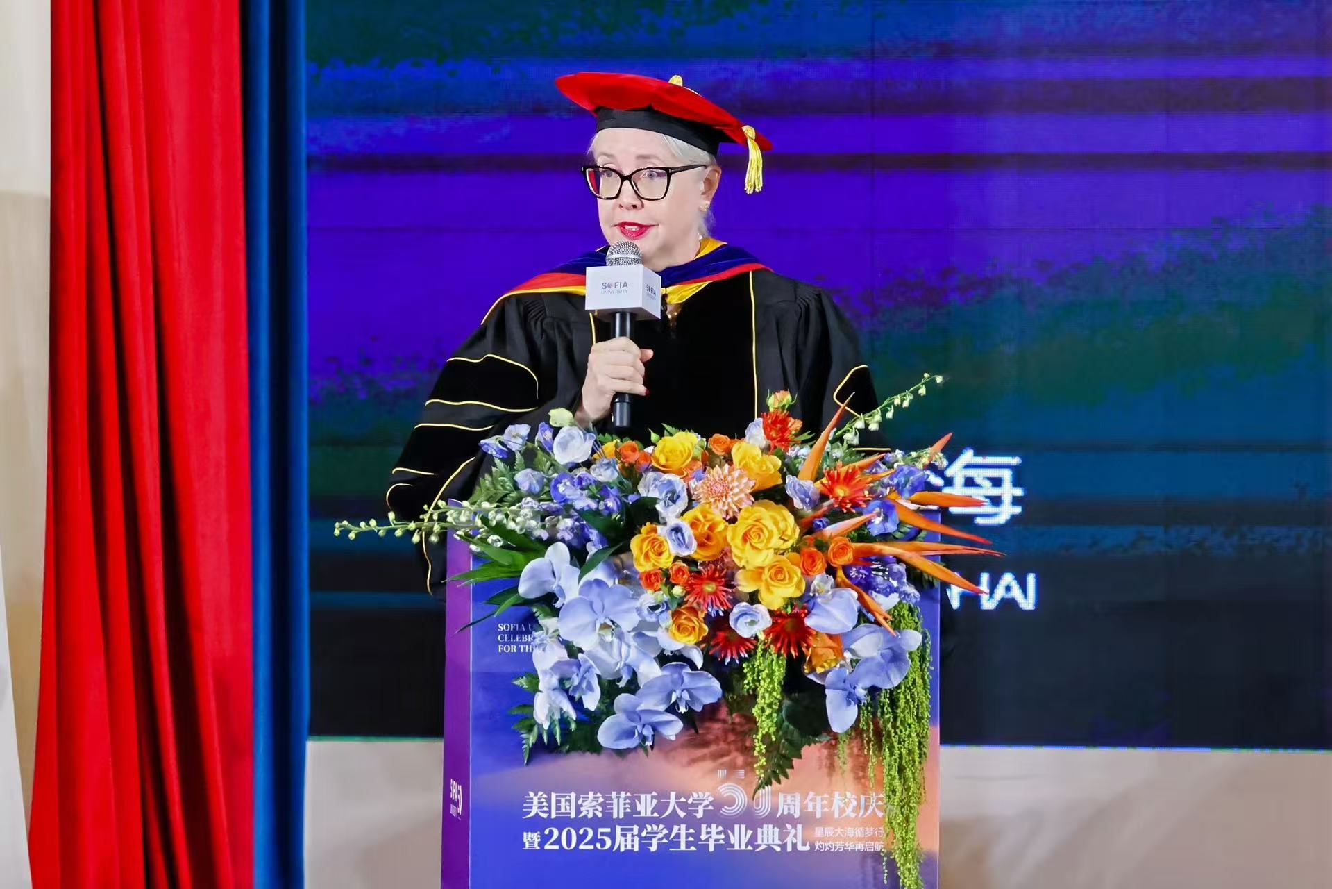 美国索菲亚大学协理副校长王雅俐带领毕业生与校友共同回顾了索菲亚大学五十年来的发展历程。她指出,索菲亚不仅是一所传播知识的高等学府,更是连接中美、融汇东西方文化的桥梁。她特别介绍了大学自创立之初即提出的“五维”全人教育理念,涵盖智力、身体、情绪、心灵、社区服务与创造性表达等多个维度,致力于推动个体全面成长与社会贡献相结合。她强调,索菲亚大学于1998年成为全球首个系统实施多维全人整合教育的高校。“我们未必事事如愿,但我们的道路始终向善”,她鼓励毕业生肩负时代责任,以全人教育的理念为指引,为构建更加和谐美好的世界贡献力量。