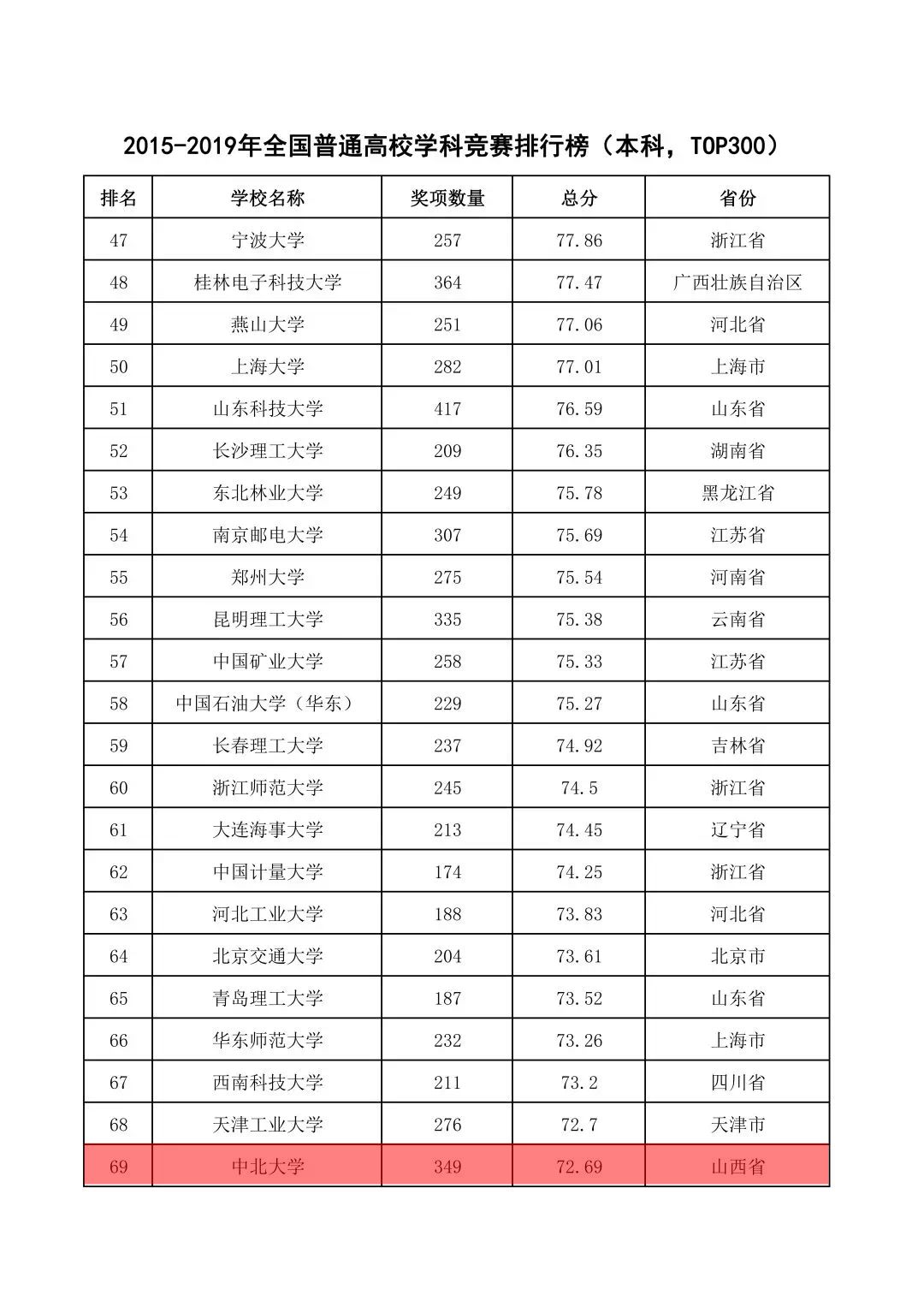 其中,在《2019全国普通高校学科竞赛排行榜》中,中北大学位列第43名(去年此项排名为100名),位居全省第一,获历史性新突破;在《2015-2019年全国普通高校学科竞赛排行榜》位列第69名(去年此项排名为86名),位居全省第二;同时,在首次推出的《2015-2019年全国地方本科院校学科竞赛排行榜》中位列第24名,位居全省第二!