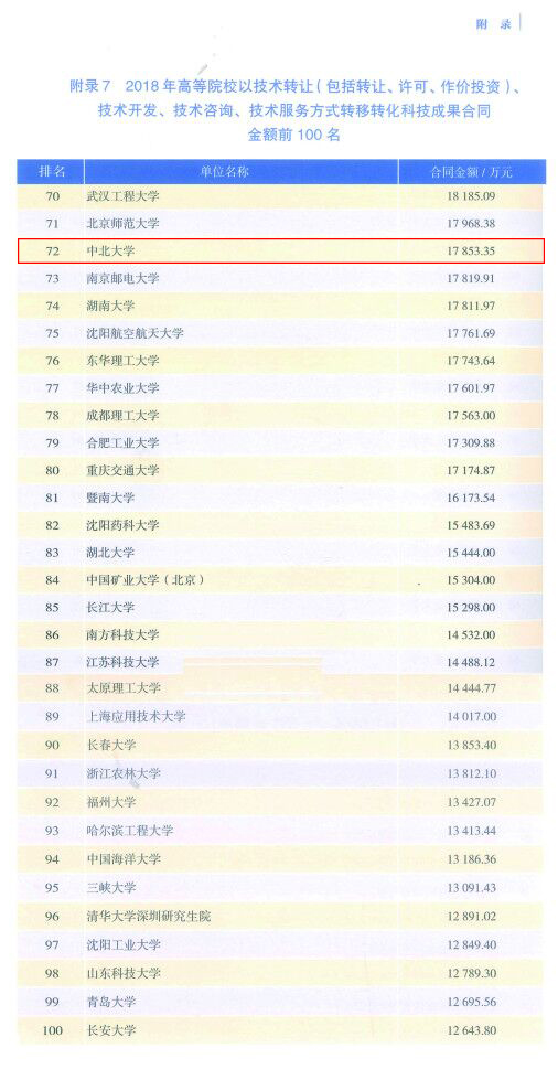 报告显示,在2018年高等学校以转让、许可、作价投资三种方式转化科技成果合同金额排行中,中北大学为山西省唯一进入前100名高校,中北大学位列第65名;在2018年高等学校以技术转让,技术开发,技术咨询,技术服务方式转移转化科技成果合同金额排行中,山西有两所高校进入前100名,中北大学位列第72名,居山西省高校首位。