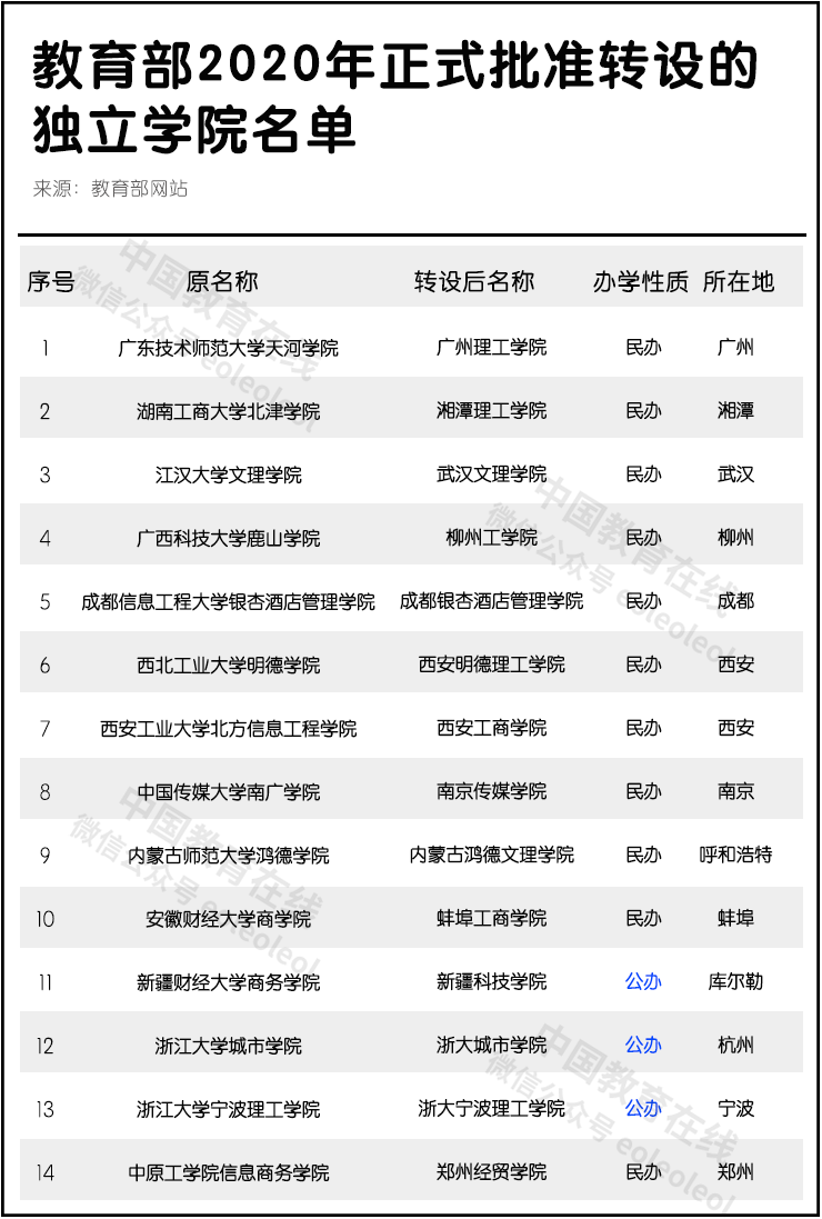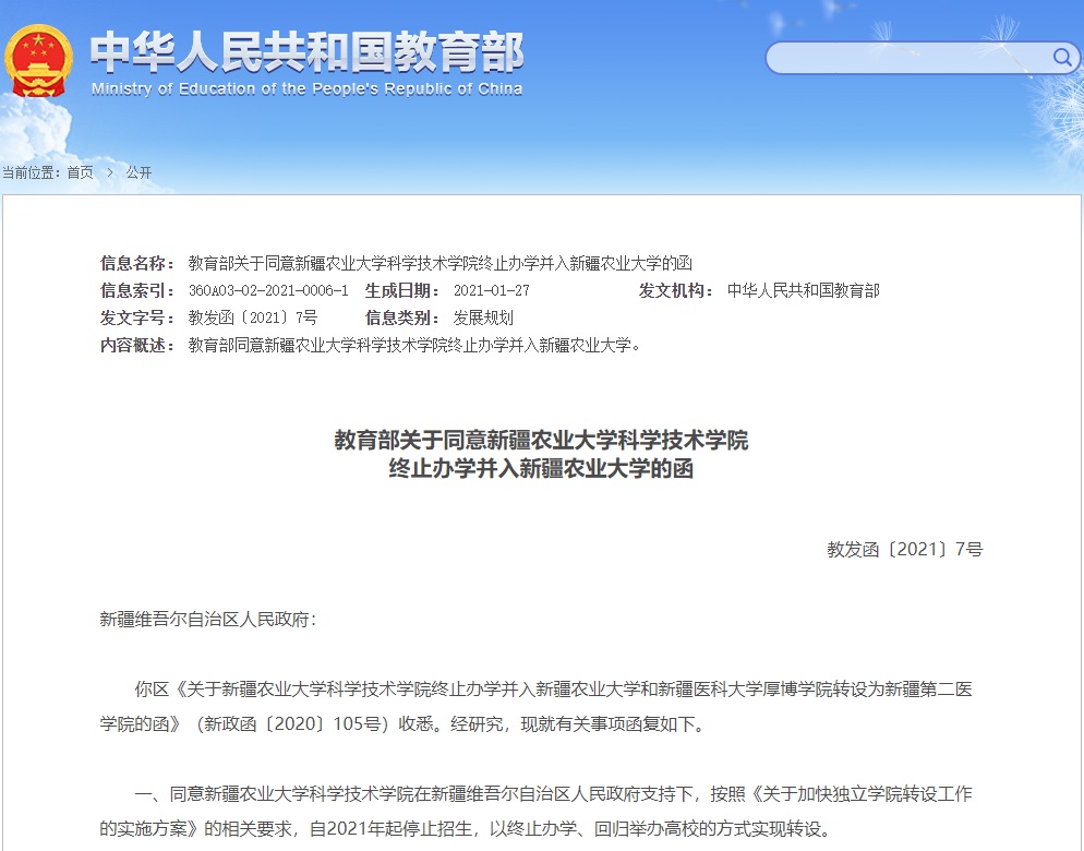 2月2日,随转设名单一起发出的,还有“金博宝最新官方网站查询网址 关于同意新疆农业大学科学技术学院终止办学并入新疆农业大学的函”、“金博宝最新官方网站查询网址 关于同意河北大学工商学院以终止办学方式实现转设的函”。