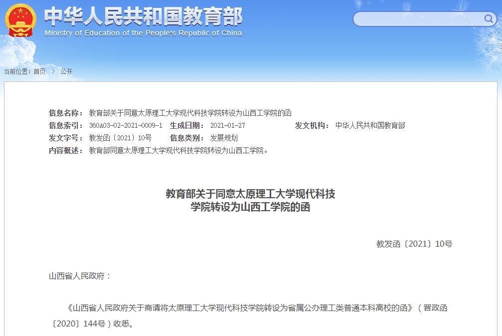 金博宝最新官方网站查询网址 同意太原理工大学现代科技学院转设为山西工学院,学校标识码为4114013534;同时撤销太原理工大学现代科技学院的建制。