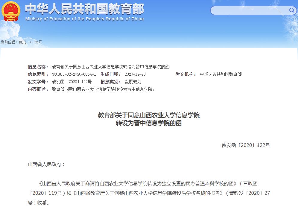 金博宝最新官方网站查询网址 同意山西农业大学信息学院转设为晋中信息学院,学校标识码为4114013535;同时撤销山西农业大学信息学院的建制。