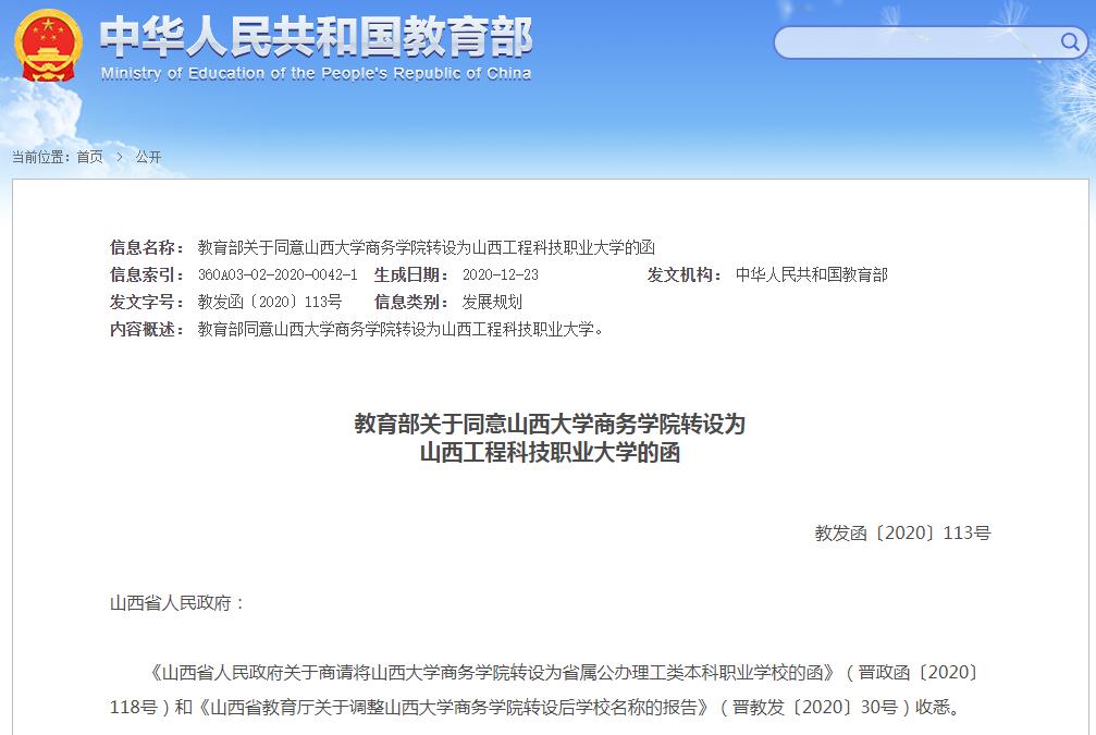 金宝搏188入口 山西站讯近日,金博宝最新官方网站查询网址 网站公布关于同意“石河子大学科技学院转设为新疆政法学院”、“太原理工大学现代科技学院转设为山西工学院”等独立学院转设更名回复函,自2021年1月至2月2日,已有33所独立学院确定更名转设。包含山西3所高校,分别是山西工学院、晋中信息学院、山西工程科技职业大学。