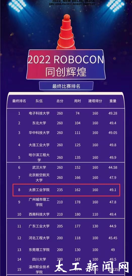 五年跌宕沉浮,再铸太工辉煌。时隔五年后太原工业学院机器人队重回全国八强,是学校近年来坚定推进应用型高校建设的阶段性成果,是学校实践教学改革不断取得成效的集中展示,也充分证明了太原工业学院在大学生综合素质培养和创新人才培养方面所取得的成效。今后太原工业学院将继续大力推进应用型高校建设,积极鼓励师生科技创新,为地方经济建设和科技产业发展注入新动力。