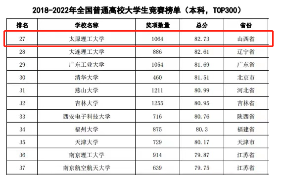 在《2018—2022年全国普通高校大学生竞赛榜单(本科,TOP300)》中位列第27位,较上一年度提升7位。