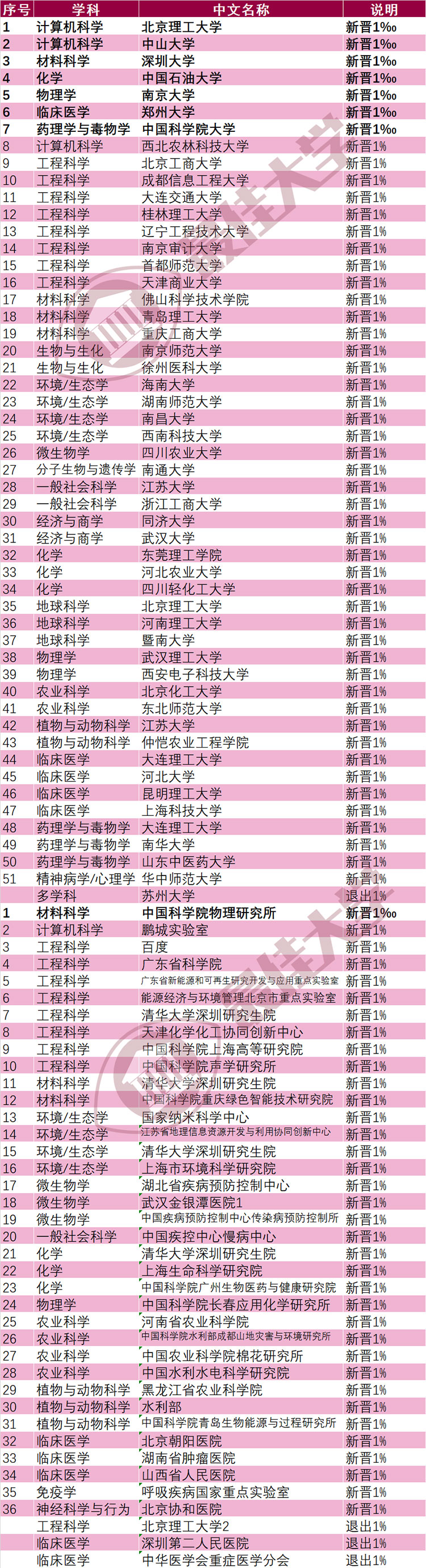 新晋千分之一的7个学科分别为北京理工大学、中山大学的计算机科学,深圳大学的材料科学(今年5月深圳大学工程科学晋升千分之一),中国石油大学的化学,南京大学的物理学,郑州大学的临床医学,中国科学院大学的药理学与毒物学,无千分之一学科退出。全国高校共44个学科新晋升全球前1%,包括佛山科学技术学院的材料科学、东莞理工学院的化学、暨南大学的地球科学、仲恺农业工程学院的植物与动物科学等。大连理工大学、江苏大学各新晋2个学科,另有40所高校新晋1个学科,共计42所高校。详见下表。