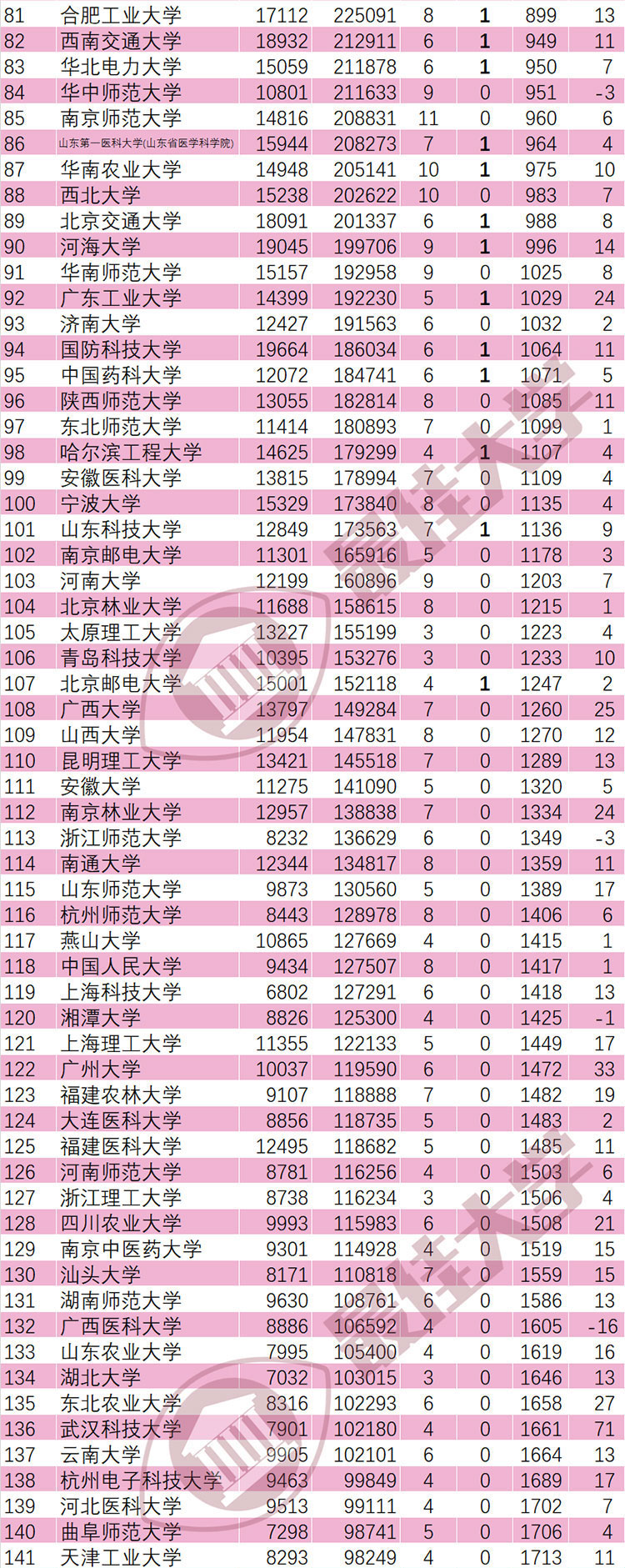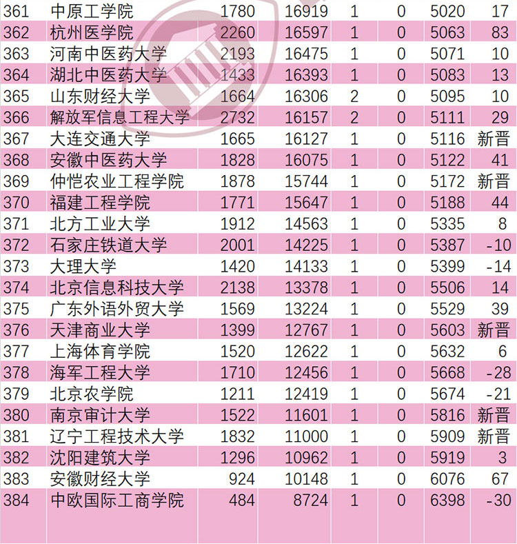 另外,湖北理工学院(488)、湖北医药学院(202)、成都大学(126)、湖州师范学院(87)、西南财经大学(86)、佛山科学技术学院(84)、杭州医学院(83)、成都中医药大学(75)、青岛理工大学(74)、武汉科技大学(71)、中南财经政法大学(68)、安徽财经大学(67)、宁波诺丁汉大学(63)、华东交通大学(63)、北京工商大学(60)、对外经济贸易大学(60)进步均超过60名,表现强劲。