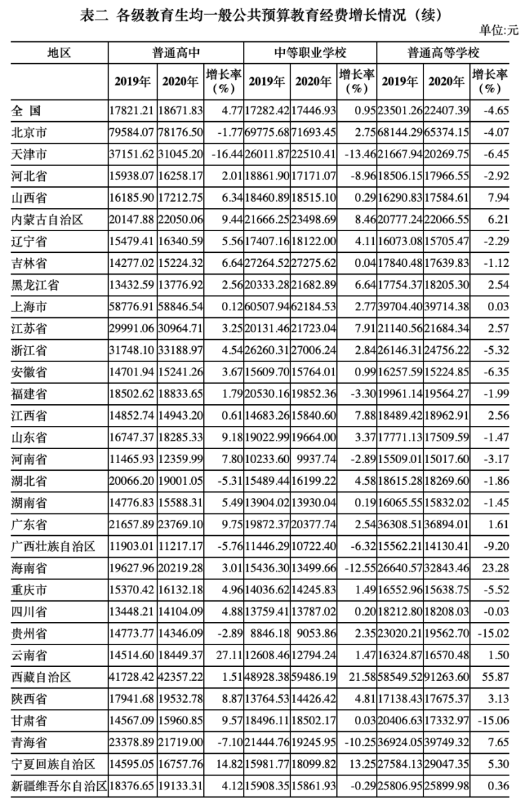 6.全国普通高等学校为22407.39元,比上年的23501.26元减少4.65%。增长最快的是西藏自治区(55.87%)。