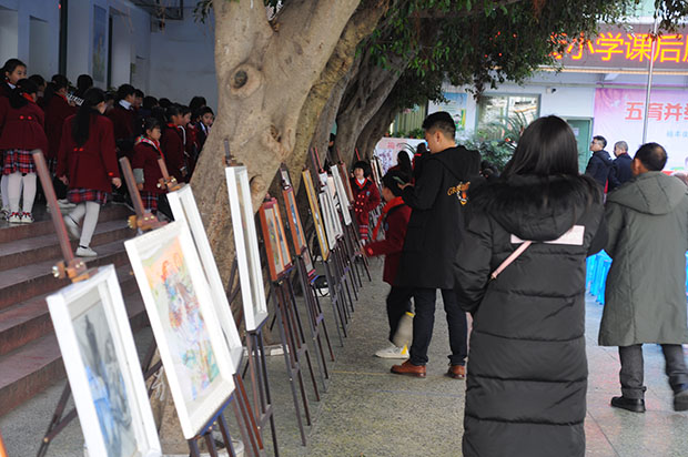 在优秀作品展览区域,一张张绚丽的图画、一幅幅充满灵气的书法、一件件稚趣盎然的手工作品整齐陈列,家长们欣赏着一件件展品,赞不绝口。一位家长看见自己孩子的作品时,激动地说:“很高兴孩子有了一个兴趣特长。感谢老师的付出,感谢学校给孩子提供了发展特长的平台!”