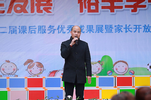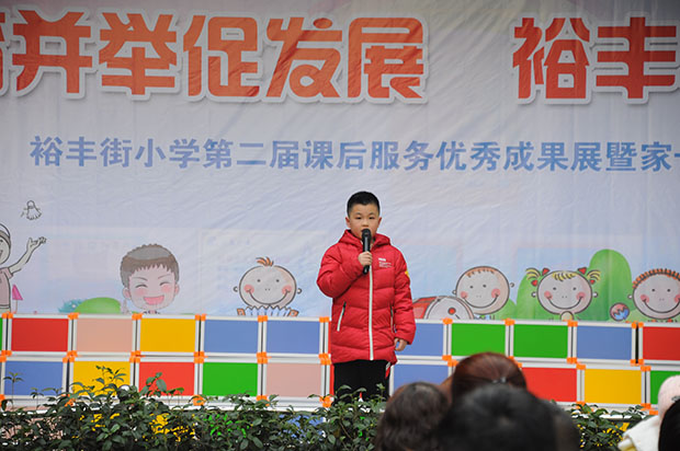 参观完孩子们的优秀作品展览后,家长们到节目展演区就座。裕丰街小学校长陈旭刚在致辞中欢迎各位家长代表的到来,邀请大家一起观看孩子们的风采展示,感悟孩子们的成长、快乐和幸福。一年级的学生代表还给家长代表们分享了自己参加课后服务一学期以来的收获。
