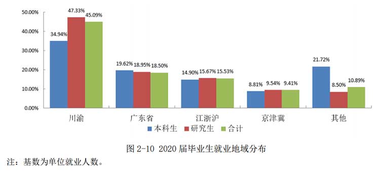 2020届毕业生就业地域主要集中在川渝、广东省、江浙沪和京津冀,其中超过40%的毕业生选择留在川渝。