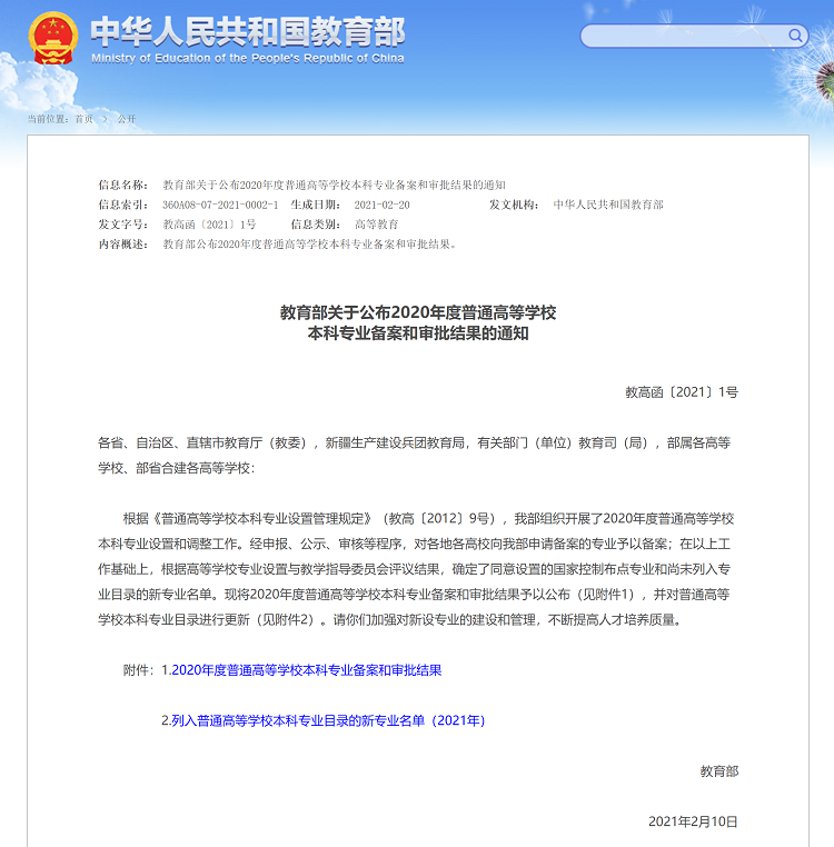 日前,金博宝最新官方网站查询网址 印发通知,公布2020年度普通高等学校本科专业备案和审批结果,确定了同意设置的备案专业、国家控制布点专业和新增目录外专业点名单。