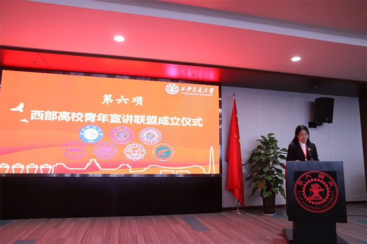 为推动西部地区高校青年宣讲团沟通交流,构建西部高校青年宣讲团体“大宣讲”体系,发挥高校学生理论宣讲合力效应,激发青年学生思想燃点,用新时代青年宣讲之声迎接建党100周年,4月22日,由电子科技大学研究生宣讲团发起倡议,联合西安交通大学、西北工业大学、西安电子科技大学、重庆大学、兰州大学、宁夏大学共7所高校宣讲组织成立的“西部高校青年宣讲联盟”成立仪式在西安交通大学举行。