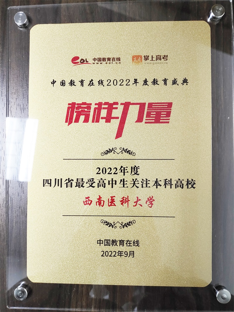 “榜样力量·2022年度教育盛典”评选获奖名单揭晓,西南医科大学荣获“2022年四川省最受高中生关注本科高校”荣誉称号。