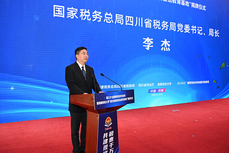 3月30日,第32个全国税收宣传月启动暨“四川省税收普法教育基地”揭牌仪式在西南财经大学举行,以“税惠千万家 共建现代化”为主题的税收宣传月活动正式启动。四川省税务局党委书记、局长李杰,四川省司法厅二级巡视员王勤,四川省税务局党委副书记、成都市税务局党委书记、局长李杰生,四川省税务局党委委员、总经济师白冰;西南财经大学党委副书记、校长卓志,党委副书记马骁,党委常委、副校长桂富强出席仪式。