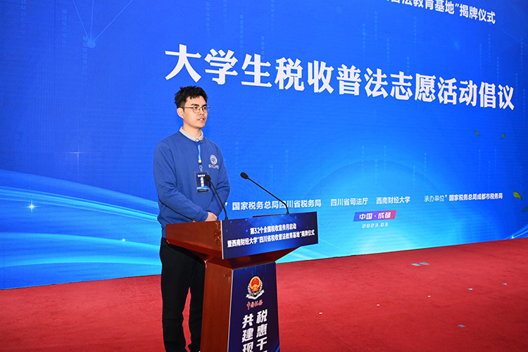 仪式上,李杰与卓志共同为四川省税收普法教育基地揭牌,与会领导为大学生税收普法志愿者颁发证书,激励大学生强化税收意识,树立税收法治观念。西南财经大学财政学专业学子代表四川大学生税收普法志愿者发起倡议,将携手共进、勠力同心,倡导诚信纳税理念,争当税收普法“宣传者”、诚信纳税“倡导者”、税收共治“参与者”。