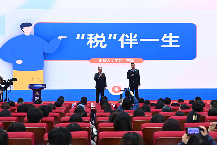 活动现场,丰富多彩的系列活动在学校师生中掀起了税务宣传热潮。在针对高校学子的税收政策大讲堂中,青年税收政策宣讲员以生动有趣的相声形式讲解了税收基本知识、系列支持大学生就业创业税费服务举措,并通过鲜活案例解读大学生最为关切的税惠政策和热点问题。在现场设置的“智慧办税”“政策辅导”“税史博览”和“就业服务”四大展区,智能办税展示、一对一政策咨询、四川税收发展历程介绍,以及高频办税缴费事项和公务员招录政策讲解成为反响热烈的专业税收课堂。精心设计的税收文创打卡区更通过税收知识拍照分享等体验感十足的活动吸引了众多同学的参与。