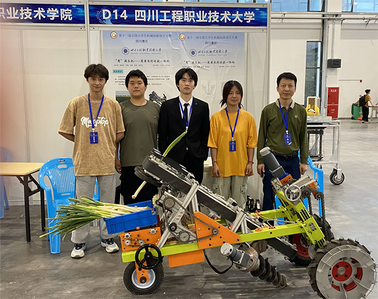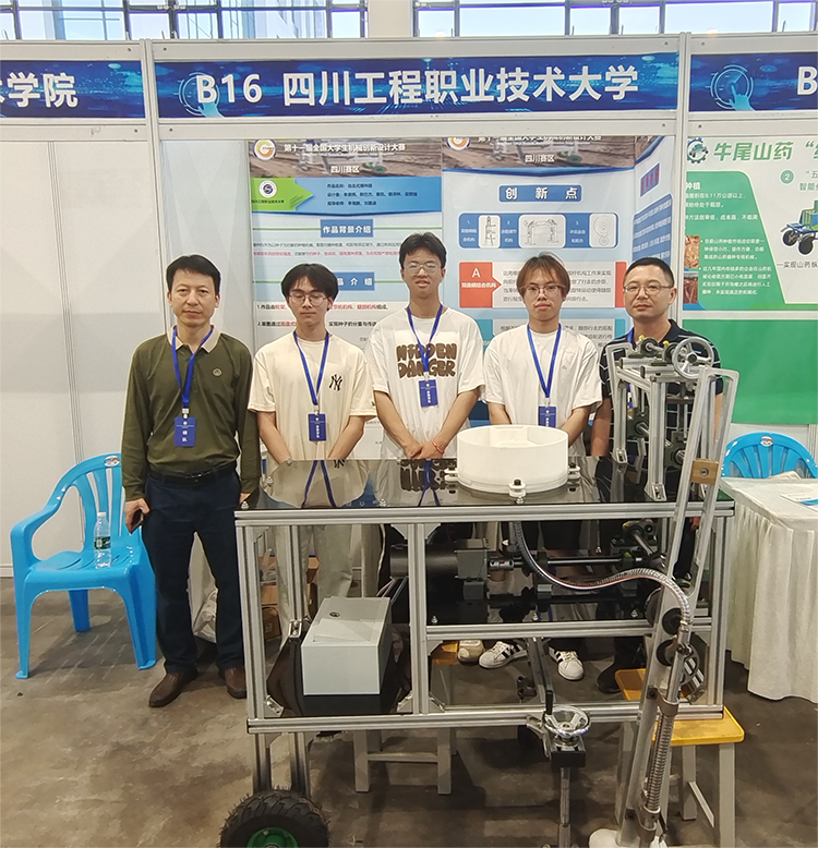 比赛过程中,经过现场作品展示与问辩、分组答辩、专家评审等环节,四川工程职业技术大学参赛团队沉着应对、表现出色,充分展现了良好的创新设计意识、综合设计与制造能力及团队协作精神,展现了学校学子的无穷创造力与蓬勃朝气。最终,经过层层比拼,“‘葱’满生机——葱黄采挖收获一体机”“自走式播种机”两项作品斩获一等奖。