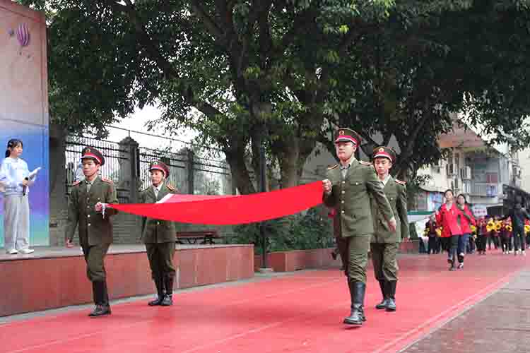 伴随着激情澎湃的运动员进行曲,首先映入眼帘的是五星红旗,旗手们手擎红旗,迈着坚定的步伐向主席台走来,紧接着是学校校旗、花环方阵以及彩旗方阵。