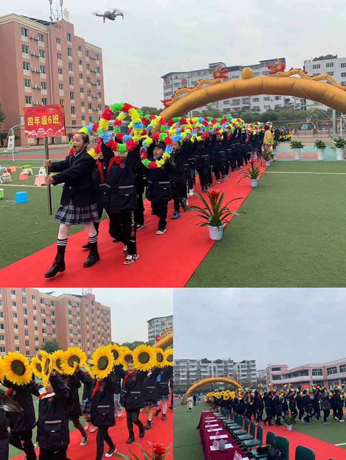 放飞理想,激情飞扬,心怀感恩和喜悦的孩子们在老师的带领下昂首阔步跨过成长之门,象征着他们从稚嫩童年成长为翩翩少年。