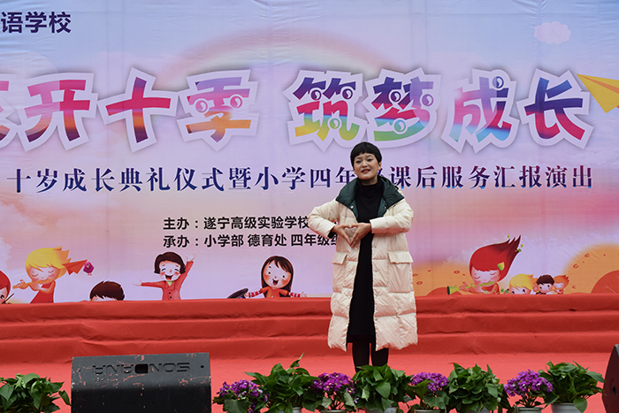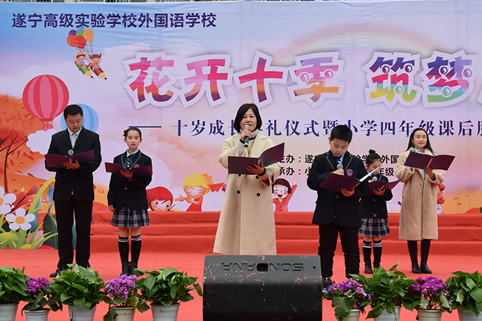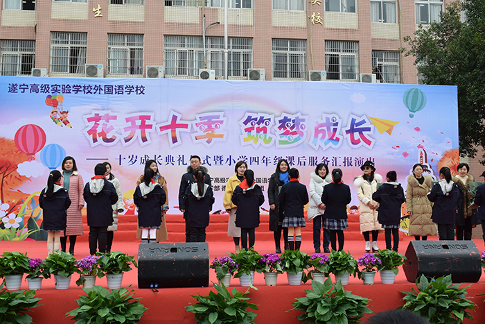 2020年12月9日,在一群心怀感恩的孩子的笑容里,遂宁高级实验学校外国语学校四年级的孩子们在校领导、老师及家长的高度关注下举行了“花开十季 筑梦成长”的成长礼活动。活动分为“成长”、“感恩”、“梦想”三个篇章,给孩子们带来了别开生面而又充满仪式感的十岁成长礼。
