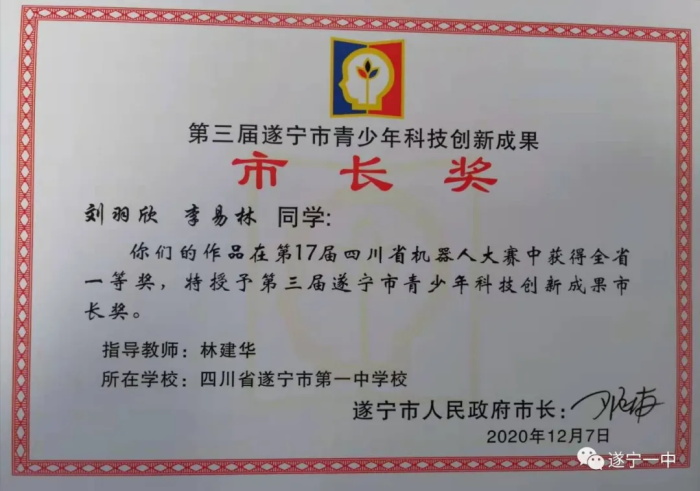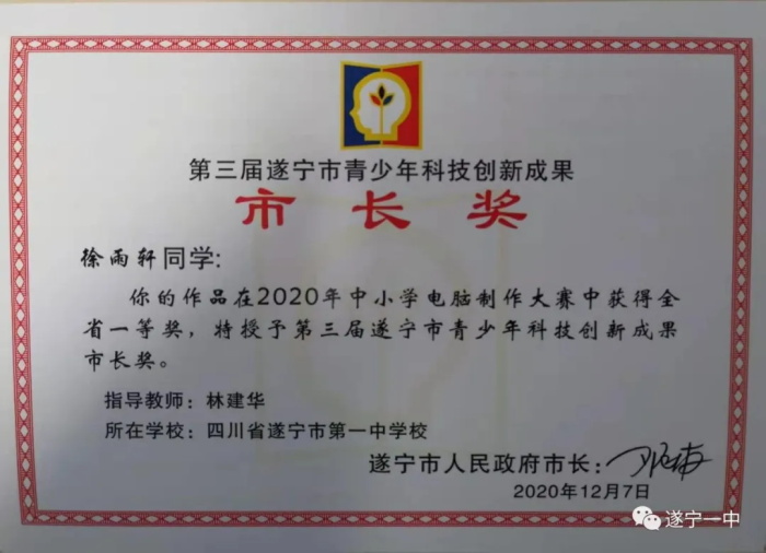 今年,遂宁一中7名同学:初二1班徐雨轩、初二10班李易林、初二3班刘羽欣、初二1班龙金波、王志远、初二2班唐瑞、初三1班陈子翔在信息技术教师林建华的指导下,凭借优异的表现,获得四项青少年科技创新成果市长奖。