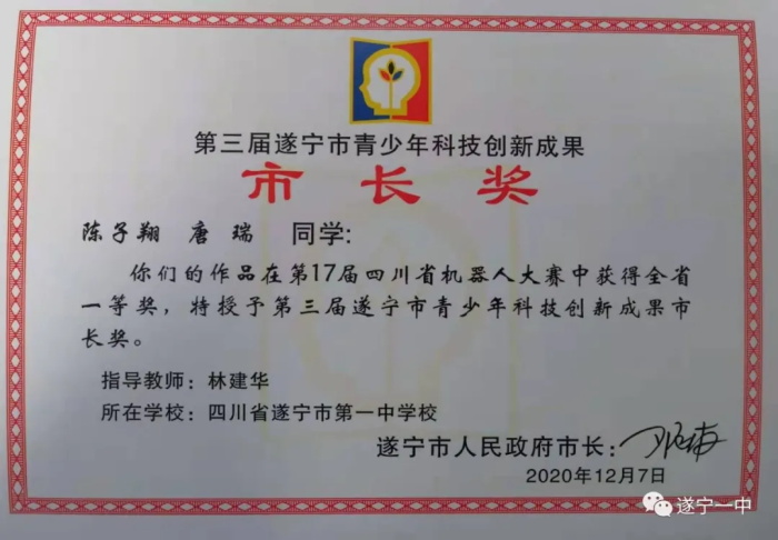 这是遂宁一中学生首次获得此项荣誉,充分体现了遂宁一中学生崇尚科学、锐意创新、积极实践、勇于创造的良好精神风貌,也体现了遂宁一中在青少年科技创新方面的高度重视。