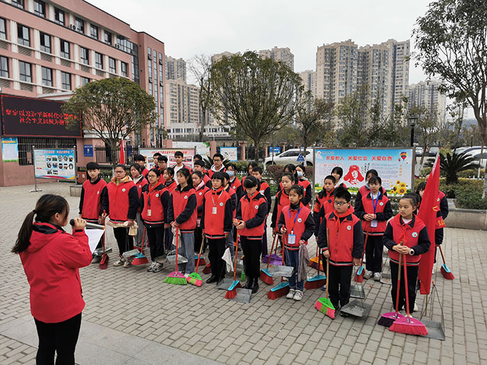 活动中,同学们分两组对校园周边和校园内进行整理和清扫活动。在老师的带领下,“环境卫生守护者”们带着扫帚、簸箕、毛巾等劳动工具,来到整理地点,开展整理和清扫活动。