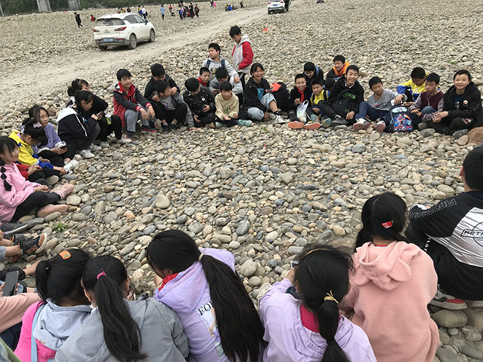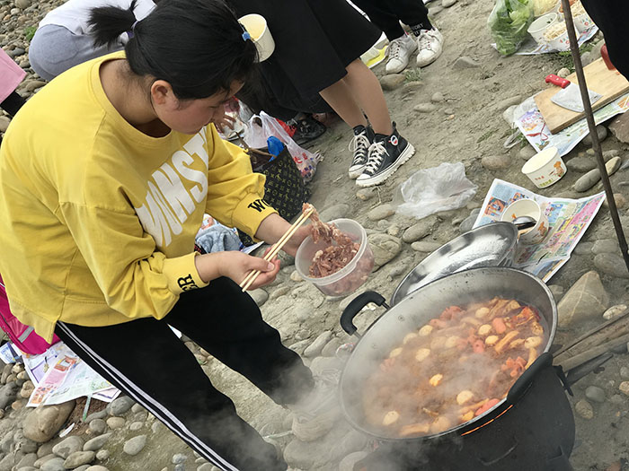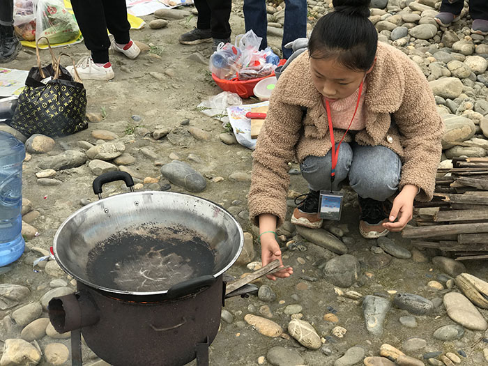 到达地点后,各班级陆续整队、清点人数,然后按照分组划分地点,每个小组都忙活起来,搭灶、找柴、点火、上锅,有的直接开始倒油炒佐料,有的先烧水再加佐料,有的先来个加餐再开始生火做饭。每个小组内组员分工明确,按部就班,大家齐心协力共同完成丰盛的午餐。