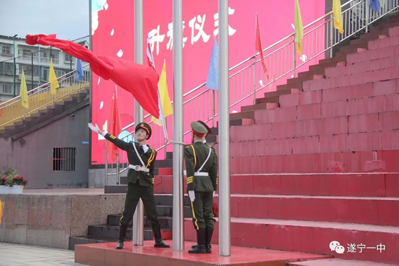 伴随着雄壮的国歌声,五星红旗冉冉升起,全体师生行注目礼。雄壮嘹亮的国歌声回荡在运动场上方,师生们以歌声中传递对祖国无限热爱与崇高敬意。