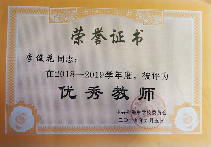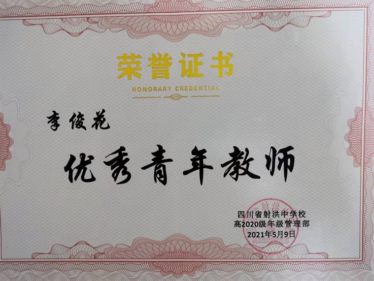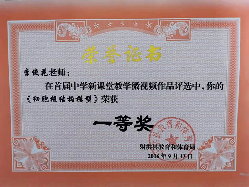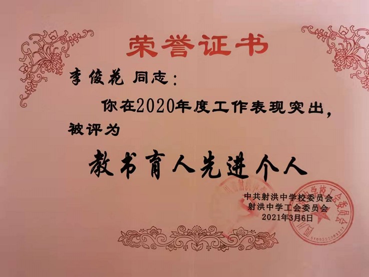教学工作是繁杂的,但为了让每一名学生都能更好的学习知识,她潜心钻研教材,认真研究教学教法,在实践中不断自我提升,不断对自己的教育教学进行研究、反思,并积极参加各项教研教学活动。她在2015年的“射洪中学青年教师高考试题测试”中荣获一等奖;教学作品《细胞核结构模型》在2016年9月“射洪县首届中学新课堂教学微视频”评选中荣获一等奖;2018年撰写的《引导高中生自主学习生物的策略研究》在射洪县“中学教育教学优秀论文和校本教研经验文章”评选中获二等奖;2020年10月和同事共同研究、完成的教学案例在全国教育科学“十三五”规划课题《大数据背景下实施精准教学的实践研究》典型案例评选活动中荣获贰、三等奖。她曾多次获得“优秀共产党员”、“优秀教师”、“教书育人先进个人”等荣誉称号。