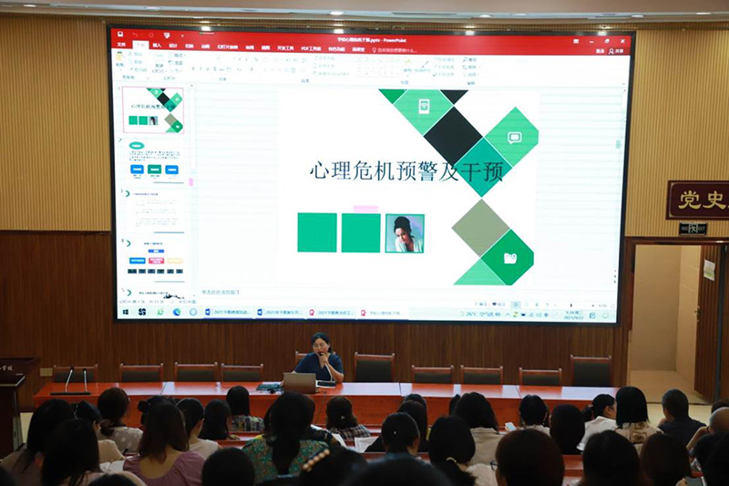 会议第二阶段,心理辅导老师奉凰对“老师们在工作中如何调整自己不良的情绪”和“学生在成长过程中不良表现的原因”进行了专业分析和理论指导,通过实际案例剖析,让老师们懂得了处理应急事件的方法。