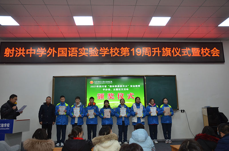 12月27日,射洪中学外国语实验学校在学术报告厅举行隆重颁奖仪式,为在四川省教育厅、四川省林业和草原局组织的“森林草原防灭火”安全教育手抄报活动和安全教育主题征文活动中荣获一、二、三等奖的24名同学颁发奖状、奖品,为荣获“优秀指导教师奖”的12名老师颁发奖状。据悉,该校获奖学生和教师人数在此次活动中居遂宁市之最,学校荣获省教厅、省林业和草原局颁发的“优秀学校奖”。